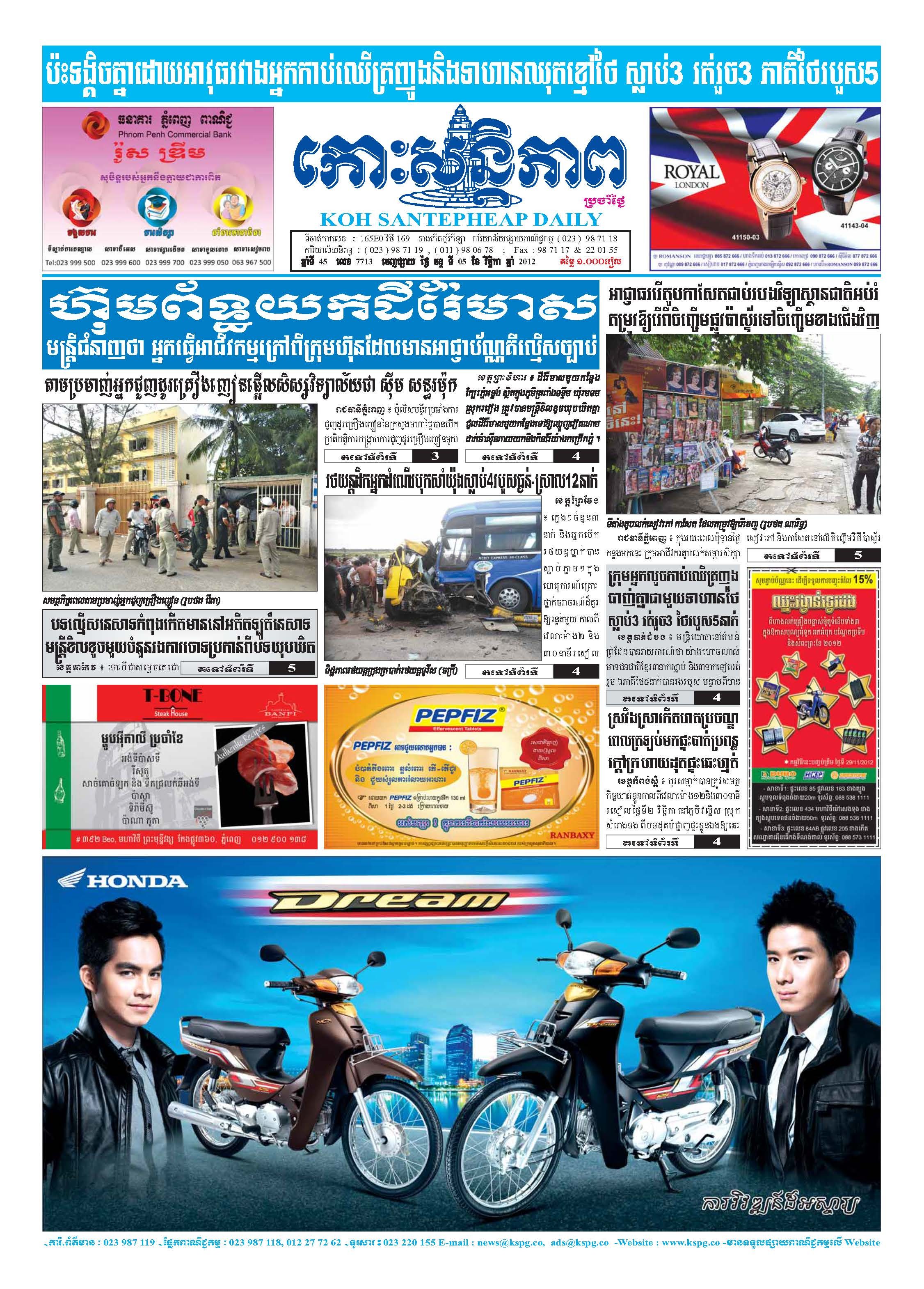 See Moreកោះសន្តិភាព ឆ្នាំទី៤៥ លេខ៧៤៨៥ ចេញផ្សាយ ថ្ងៃសៅរ៍-អាទិត្យ ទី០៤-០៥ ខែកុម្ភៈ ឆ្នាំ២០១២