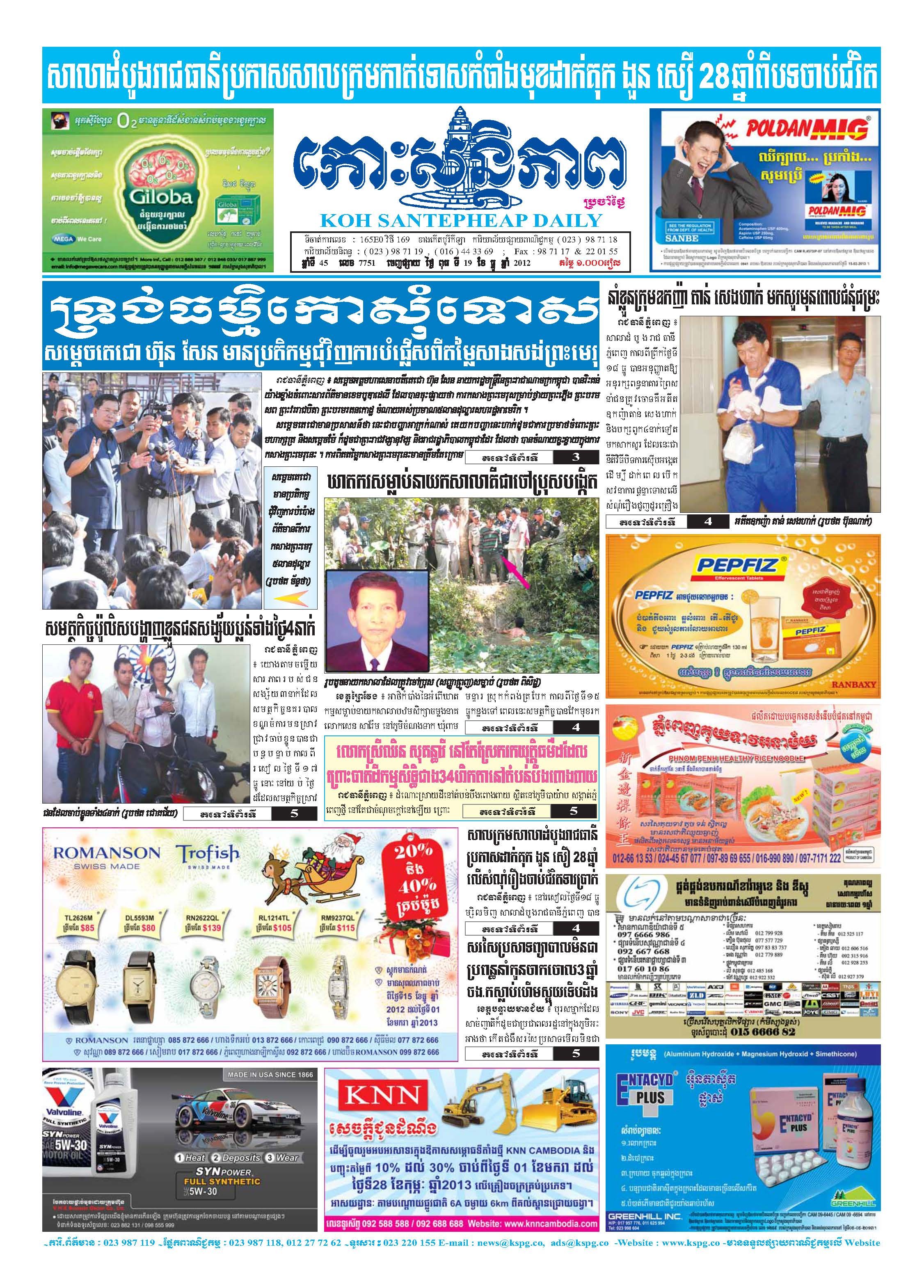 See Moreកោះសន្តិភាព ឆ្នាំទី៤៥ លេខ៧៥៧២ ចេញផ្សាយ ថ្ងៃចន្ទ ទី២១ ខែឧសភា ឆ្នាំ២០១២