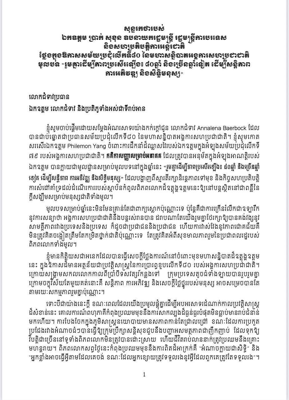 សុន្ទរកថារបស់ ឯកឧត្តម ប្រាក់ សុខុន ឧបនាយកដ្ឋានមន្ត្រី រដ្ឋមន្ត្រីការបរទេសនិងសហប្រតិបត្តិការអន្តរជាតិ ថ្លែងក្នុងឱកាសសម័យប្រជុំលើកទី៨០ នៃមហាសន្និបាតអង្គការសហប្រជាជាតិមូលបទ «រួមគ្នាដើម្បីការពាភាពប្រសើរឡើង៖ ៨០ឆ្នាំ និងច្រើនឆ្នាំទៀត ដើម្បីសន្តិភាពការអភិវឌ្ឍ និងសិទ្ធិមនុស្ស»